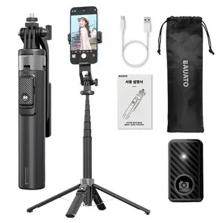 바우아토 미니 초경량 광각 촬영 모드 원터치 사각 거치 블루투스 셀카봉 삼각대, 140cm, 블랙, 1개